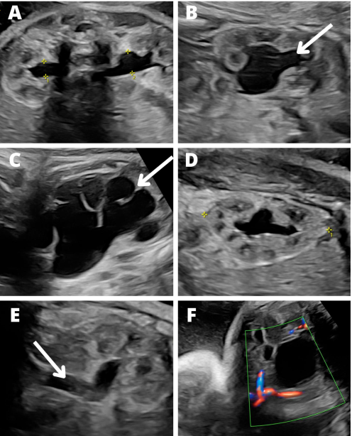 (C) kidney parenchyma thickness, arrow points at the abnormally thin parenchyma in a fetus with severe UTD at 37 weeks of gestation; (D) the